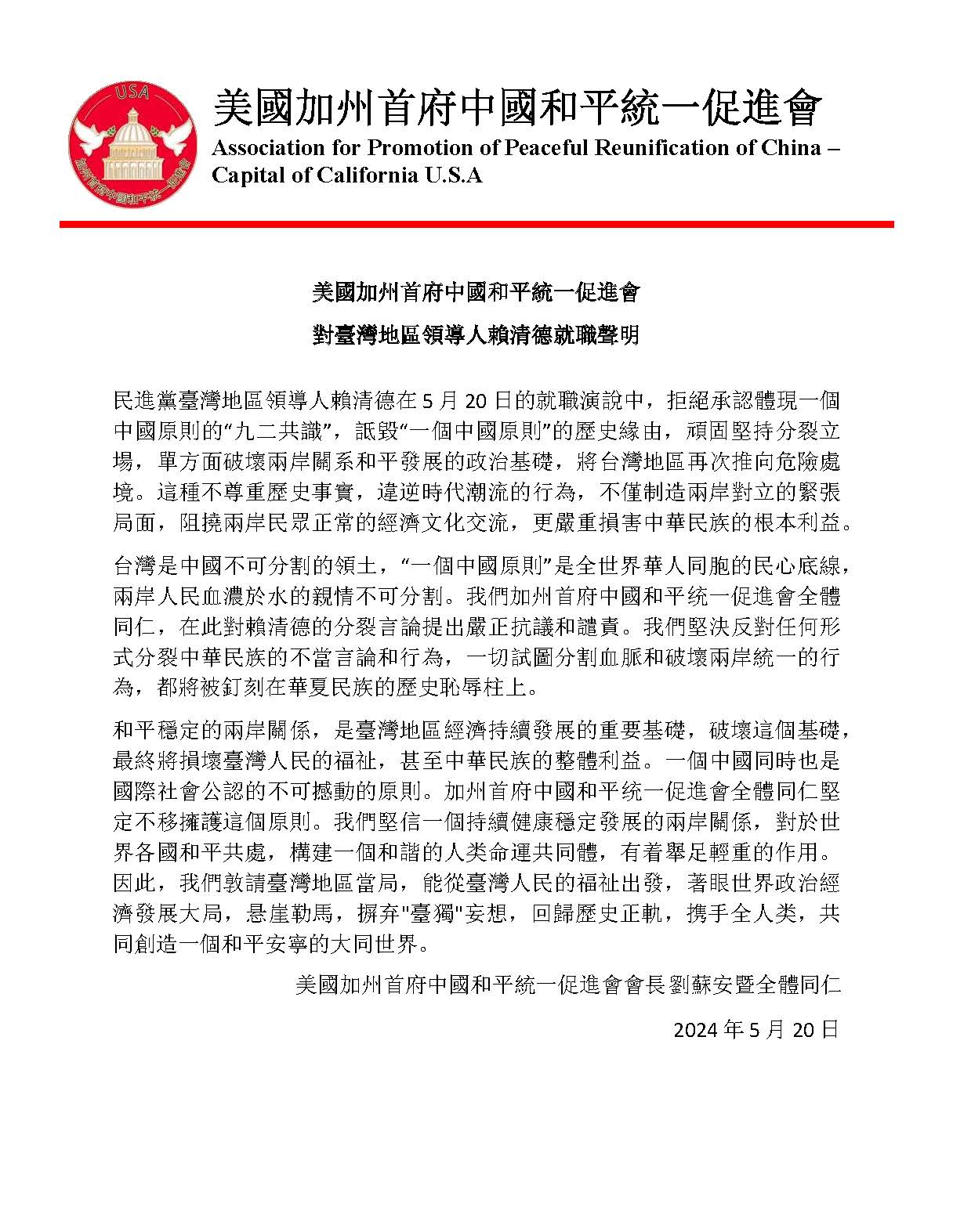民进党台湾地区领导人赖清德在 5 月 20 日的就职演说中,拒绝承认体现一个 中国原则的“九二共识”,诋毁“一个中国原则”的历史缘由,顽固坚持分裂立 场,单方面破坏两岸关系和平发展的政治基础,将台湾地区再次推向危险处 境。这种不尊重历史事实,违逆时代潮流的行为,不仅制造两岸对立的紧张 局面,阻挠两岸民众正常的经济文化交流,更严重损害中华民族的根本利益。 台湾是中国不可分割的领土,“一个中国原则”是全世界华人同胞的民心底线, 两岸人民血浓于水的亲情不可分割。我们加州首府中国和平统一促进会全体 同仁,在此对赖清德的分裂言论提出严正抗议和谴责。我们坚决反对任何形 式分裂中华民族的不当言论和行为,一切试图分割血脉和破坏两岸统一的行 为,都将被钉刻在华夏民族的历史耻辱柱上。 和平稳定的两岸关系,是台湾地区经济持续发展的重要基础,破坏这个基础, 最终将损坏台湾人民的福祉,甚至中华民族的整体利益。一个中国同时也是 国际社会公认的不可撼动的原则。加州首府中国和平统一促进会全体同仁坚 定不移拥护这个原则。我们坚信一个持续健康稳定发展的两岸关系,对于世 界各国和平共处,构建一个和谐的人类命运共同体,有着举足轻重的作用。 因此,我们敦请台湾地区当局,能从台湾人民的福祉出发,着眼世界政治经 济发展大局,悬崖勒马,摒弃"台独"妄想,回归历史正轨,携手全人类,共 同创造一个和平安宁的大同世界。 美国加州首府中国和平统一促进会会长刘苏安暨全体同仁 2024 年 5 月 20 |